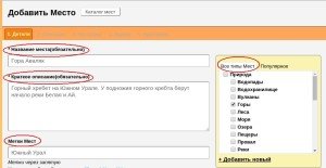Тут Вы пишете название, (например имя скалы), даете краткое описание (подробное описание будет на втором этапе). Ставите галочку к какому типу относится Ваше место, также метки, по которым удобнее всего будет искать Место.